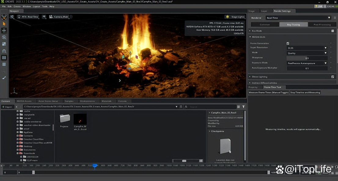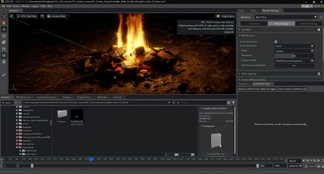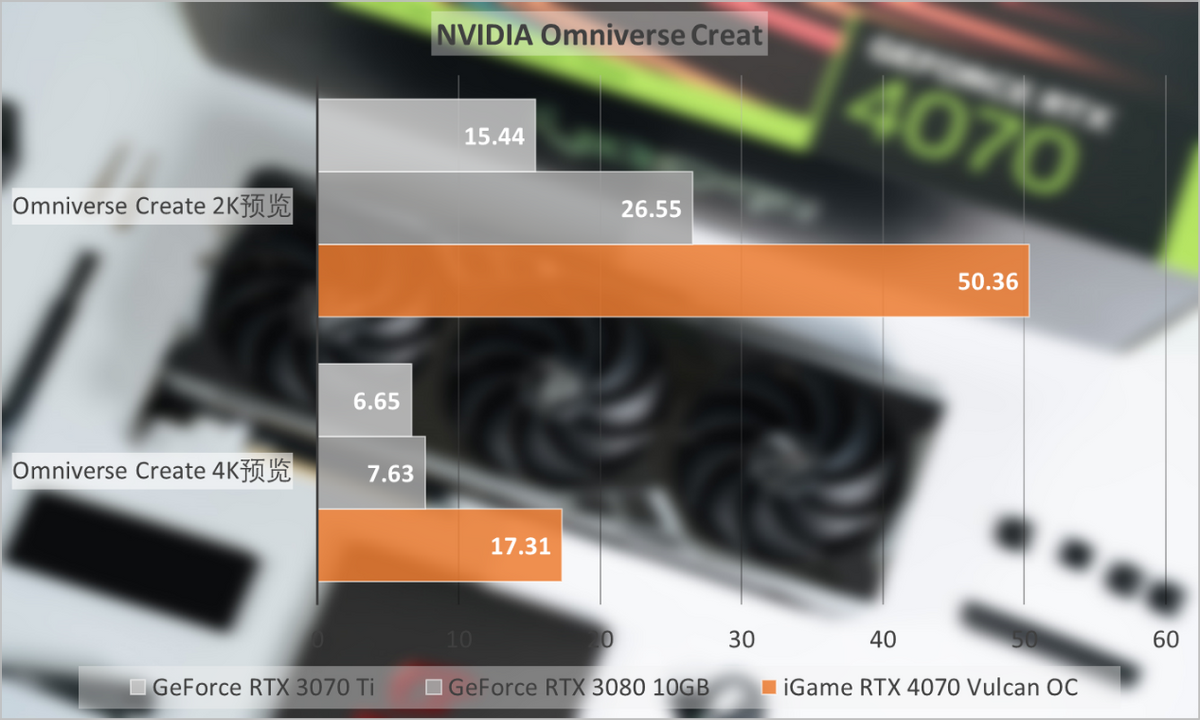 这里我们主要使用NVIDIA Omniverse Create分别在2K、4K分辨率下对Campfire、Flowers4、Incense、Jade Tiger、Warehouse五个场景进行预览测试,并计算平均值,可以看到在2K分辨率下,iGame GeForce RTX 4070 Vulcan OC相比GeForce RTX 3070 Ti性能提升接近200%,相对GeForce RTX 3080 10GB提升也有90%,主要原因是DLSS 3帮助加速了整个创作场景的运行。同样在4K分辨率预览模式下,iGame GeForce RTX 4070 Vulcan OC相比GeForce RTX 3070 Ti性能提升150%以上,相对GeForce RTX 3080 10GB提升也有100%以上。