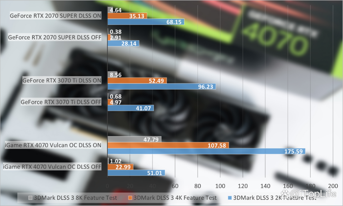 在3DMark DLSS 2 2K、3DMark DLSS 3 4K、3DMark DLSS 3 8K的测试中,能够明显发现iGame GeForce RTX 4070 Vulcan OC不仅在基础性能上领先于自己的前辈,特别在开启DLSS 3之后,比只能开启DLSS 2的RTX 2070 SUPER与RTX 3070 Ti在8K分辨率下分别高出900%和450%以上的性能,在2K和4K分辨率下也有非常明显的提升,这是相当离谱的。
