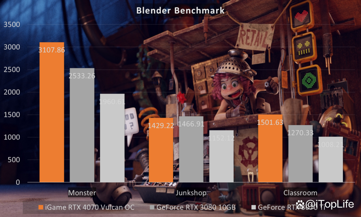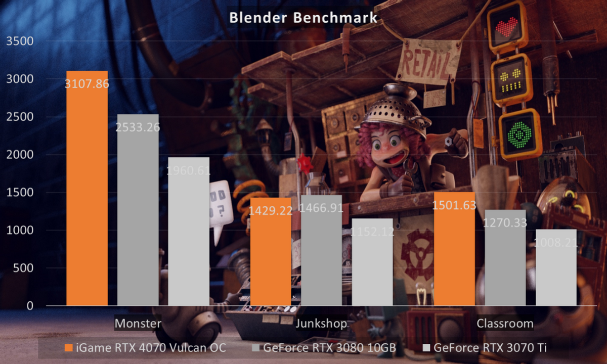 接下来是画面渲染测试。我们先使用了Blender Benchmark检测iGame GeForce RTX 4070 Vulcan OC的输出能力,在Moster、Junkshop、Classroom三个场景中,可以看到iGame GeForce RTX 4070 Vulcan OC相比GeForce RTX 3070 Ti性能提升40%以上,相对GeForce RTX 3080 10GB提升为20%以上。