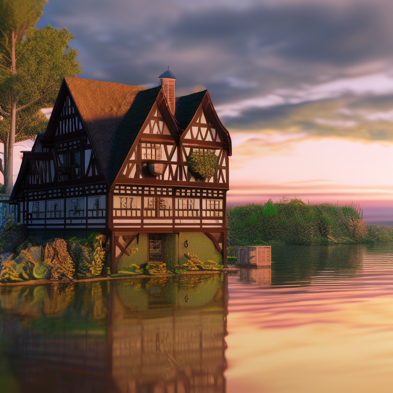 beautiful render of a Tudor style house near the water at sunset, fantasy forest. photorealistic, cinematic composition, cinematic high detail, ultra realistic, cinematic lighting, Depth of Field, hyper-detailed, beautifully color-coded, 8k, many details, chiaroscuro lighting, ++dreamlike, vignette