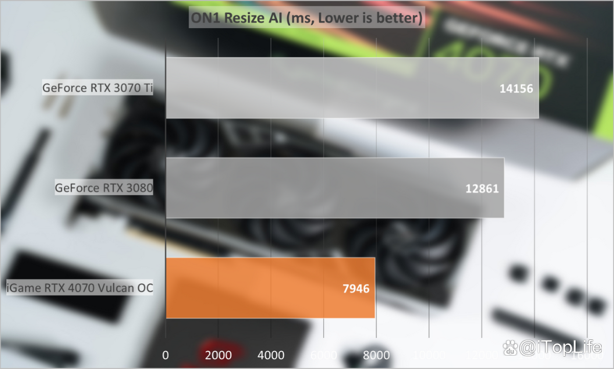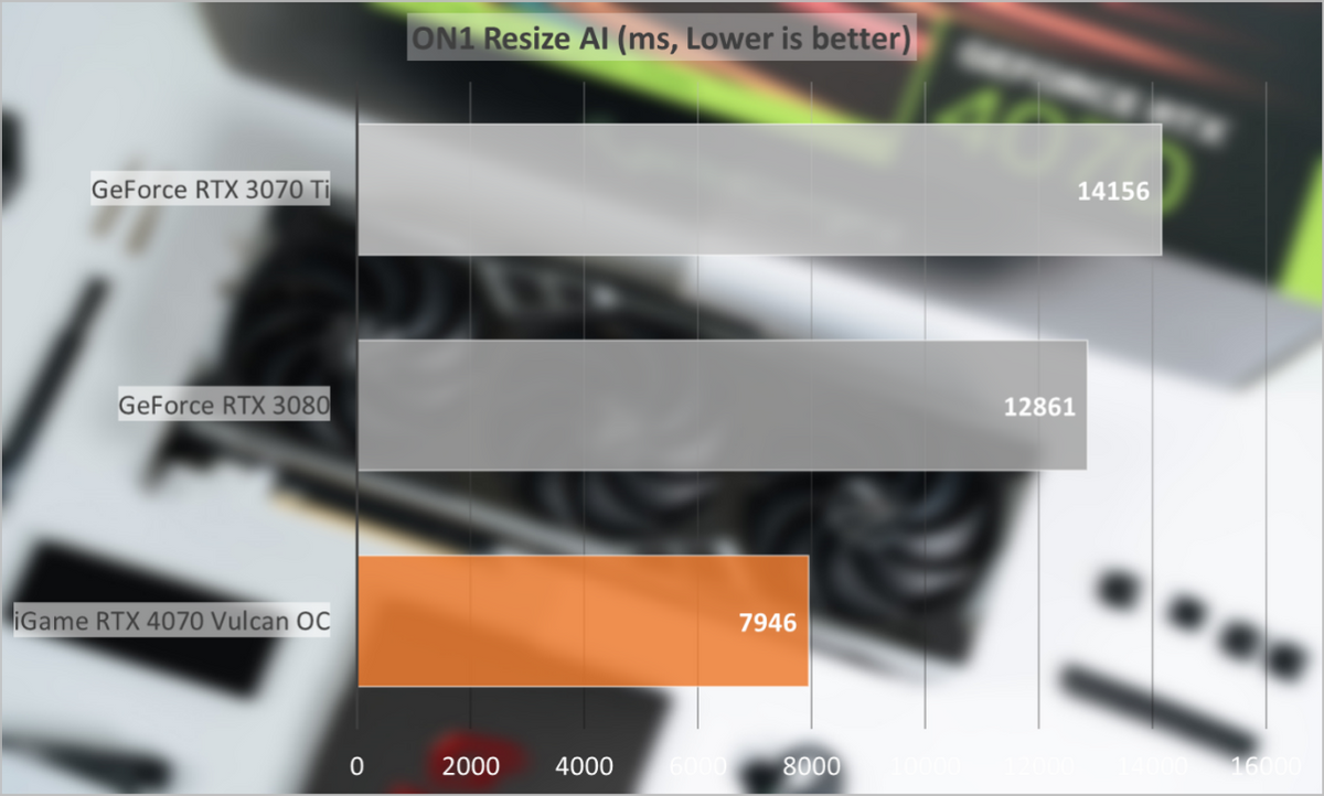 另外一项AI测试则是基于AI提升图像分辨率的ON1 Resize AI 2022,原理是对低分辨率图片无损提升至高分辨率图片,用于巨幅海报输出,依靠AI性能可以获得更快的出图,并计算生成图片的时间,数值越少意味着效率越高。