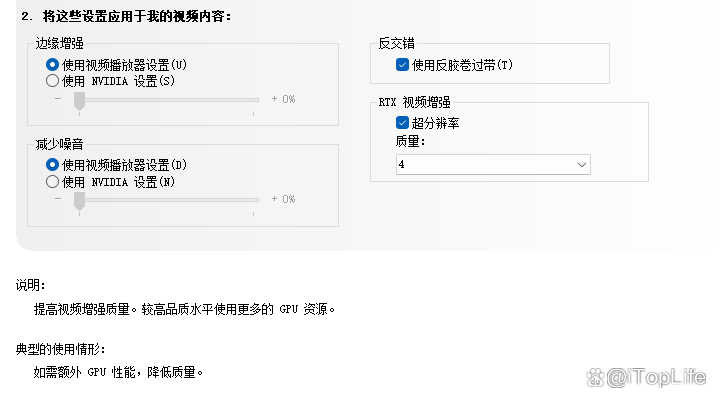 同时这也仅仅是其一。在4月12日以后的更新中,NVIDIA控制面板首次加入了RTX视频增强功能。顾名思义,这是利用RTX Video SUPER Resolution (VSR)技术,通过AI、TensorCore来增强视频播放质量,让低分辨率视频在4K分辨率屏幕上获得更好的显示效果,以增强视频观看体验。