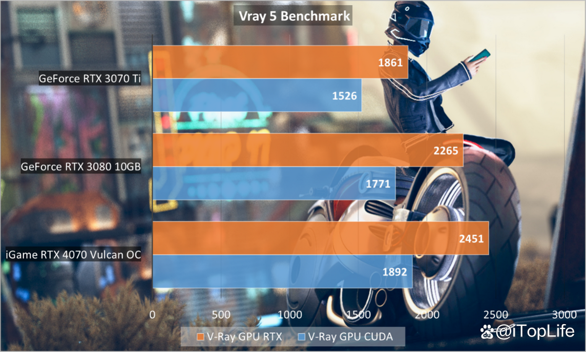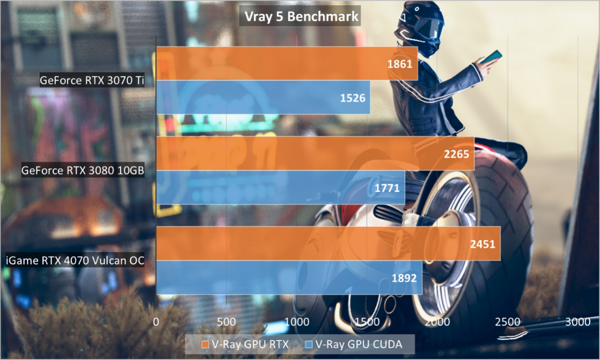 同样在V-Ray 5 Benchmark中会分别考验CUDA和光线追踪性能,iGame GeForce RTX 4070 Vulcan OC相比GeForce RTX 3070 Ti性能提升25%,相对GeForce RTX 3080 10GB提升大约为10%。