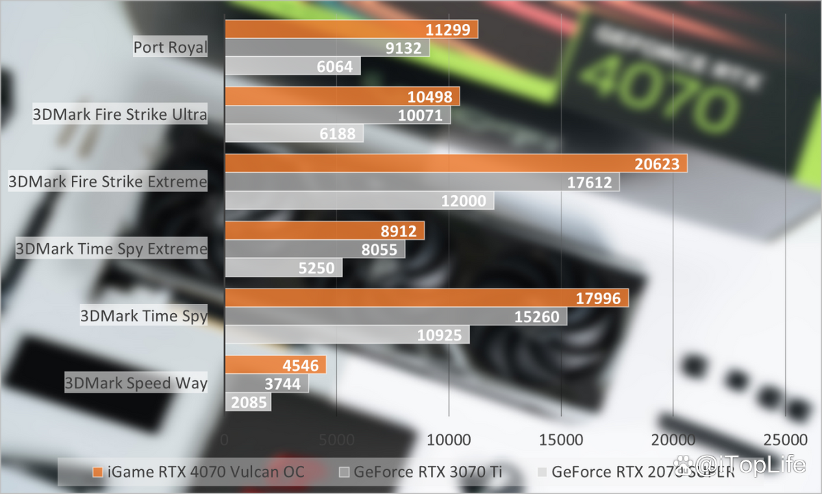 在检验DirectX 11和DirectX 12项目中,主要使用3DMark Time Spy,3DMark Time Spy Extreme,3DMark Fire Strike Extreme,3DMark Fire Strike Ultra,Port Royal进行对比。可以看到iGame GeForce RTX 4070 Vulcan OC在对比RTX 3070 Ti表现非常明显,至少有21%的提升,对比RTX 2070 SUPER,差距更大,平均提升接近92%。