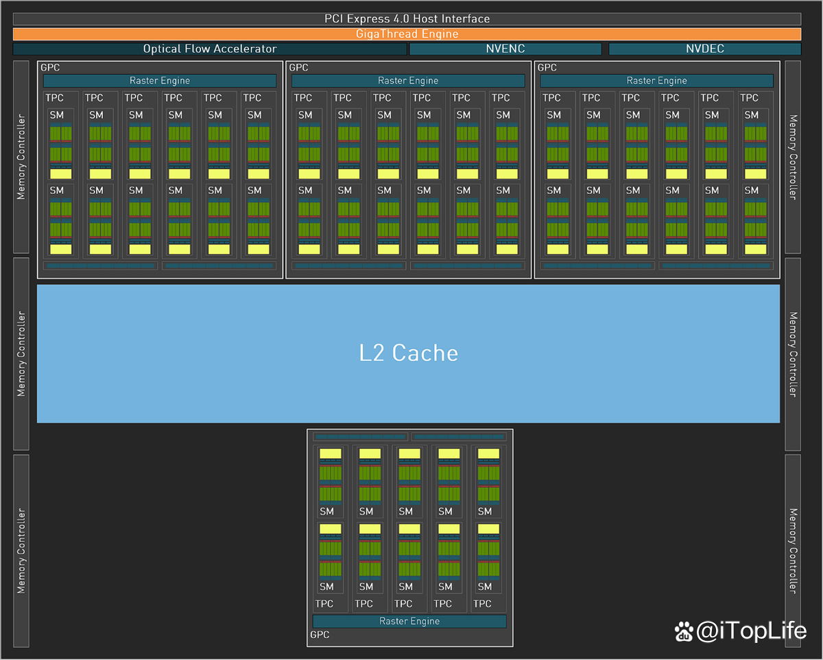 与AD104其他同门师兄一样,君采用台积电4N英伟达定制工艺打造,芯片尺寸295mm2,晶体管数量为358亿个。因此AD104也保留了Ada Lovelace架构的完整结构,即GPU中包含了若干个GPC(Graphics Processing Clusters,图形处理集群),GPC下包含若干个TPC(Texture Processing Clusters,纹理处理簇),再往下就是SM、CUDA、RT Core、Tensor Core等等。每个GPC之间包含的TPC数量相等,当GPU进行定位区分的时候再进行GPC、TPC的物理屏蔽实现。