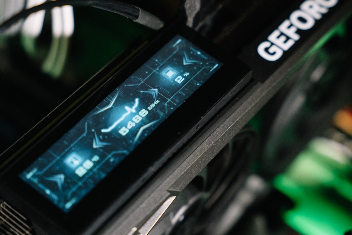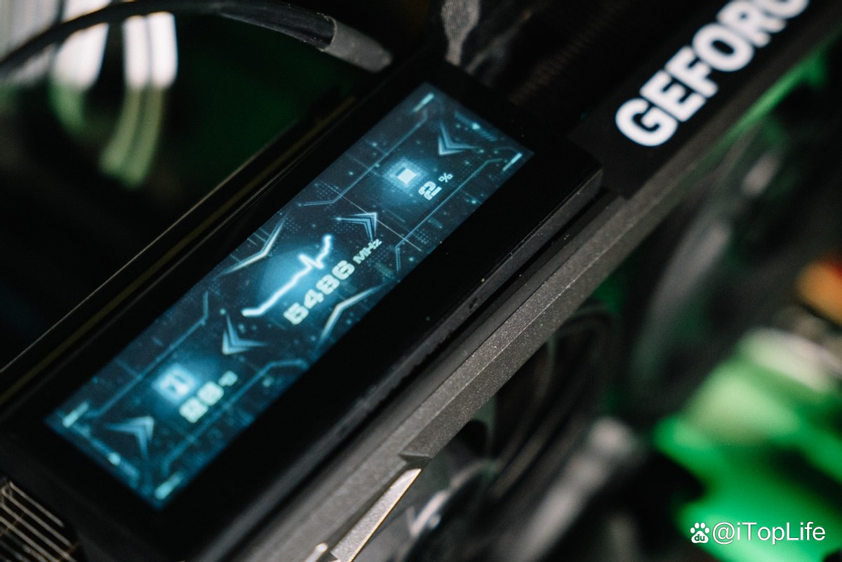iGame GeForce RTX 4070 Vulcan OC最大的差异还要属Vulcan全新的智屏功能,相比上一代的侧屏,智屏分辨率不仅从480x128升级到了800x216,并且背面使用了吸附设计,允许屏幕侧插或者竖插在显卡上方。