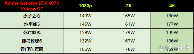 不仅如此,围绕AD104 GPU打造的周围电路还包括14+3供电,在超频状态下16pin(12VHPWR)接口可获得最高250W的供电支持,比公版Founders Edition多出了50W。不过需要注意的是,iGame GeForce RTX 4070 Vulcan OC本身的效能比非常高,在多数游戏情况下,GPU功耗会在150W到200W之间浮动,也证明了其可超频的潜力。