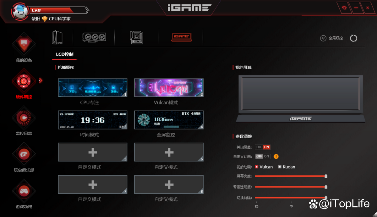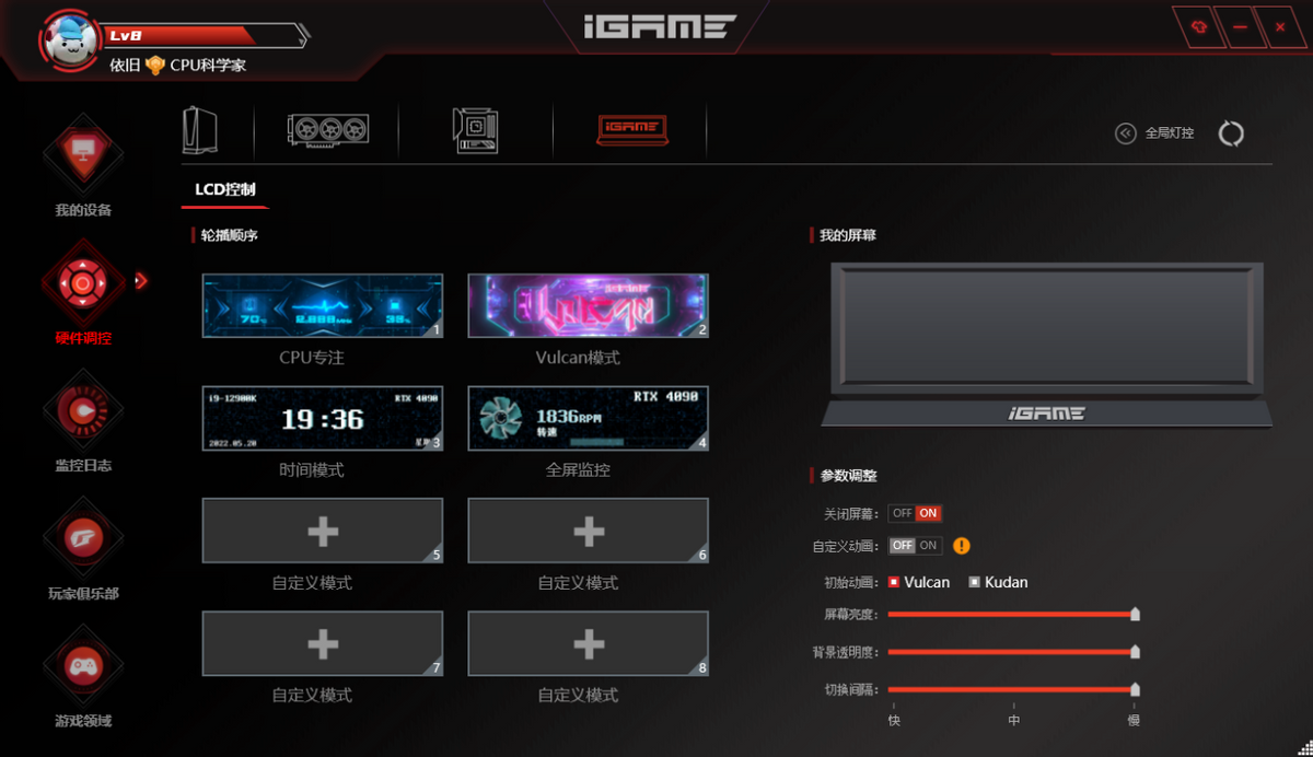 另外iGame Center中也配合智屏提供了独立的选项,可选设置全屏及双屏模式,包括GPU与CPU的运行状态,可选择轮播顺序,显示更多内容,也可以导入图片,做个性化自定义。