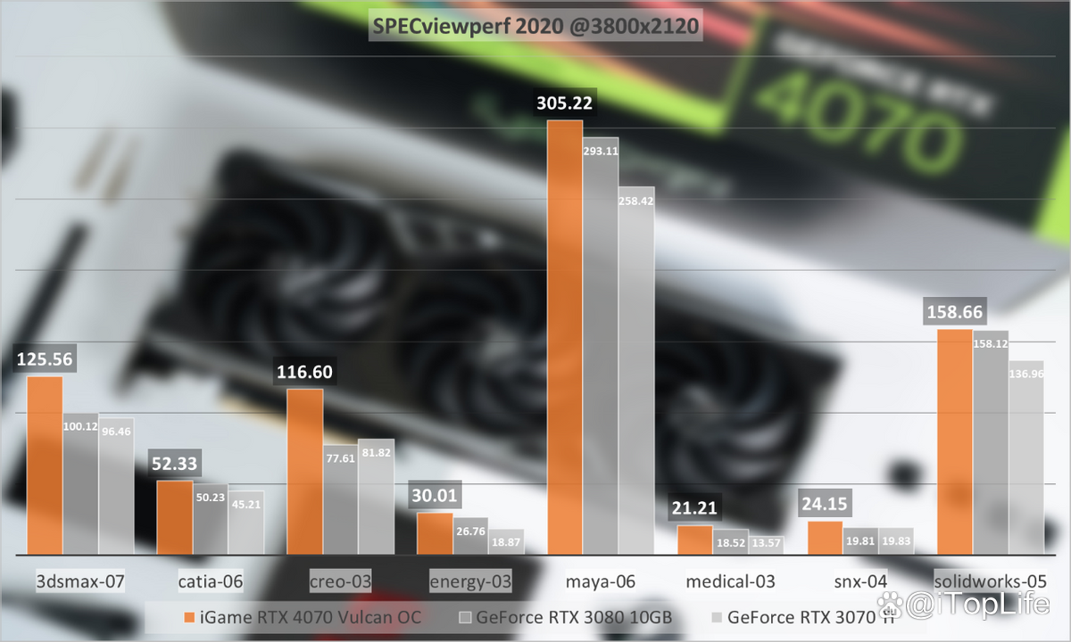 SPECviewperf 2020则是通过建模对象或渲染体的旋转和缩放检视,来检测在各种专业设计领域(包含能源勘探、医学、建筑设计、机械设计、汽车设计、飞机设计等各种领域)的图形性能,也是工程人员在日常中最常遇见的场景,其中包括3dsmax、Catia、Creo、Energy、Maya、Medical、SNX、Solidworks等主流软件。可以看到iGame GeForce RTX 4070 Vulcan OC相比GeForce RTX 3070 Ti性能提升200%,相对GeForce RTX 3080 10GB提升大约为10%左右。