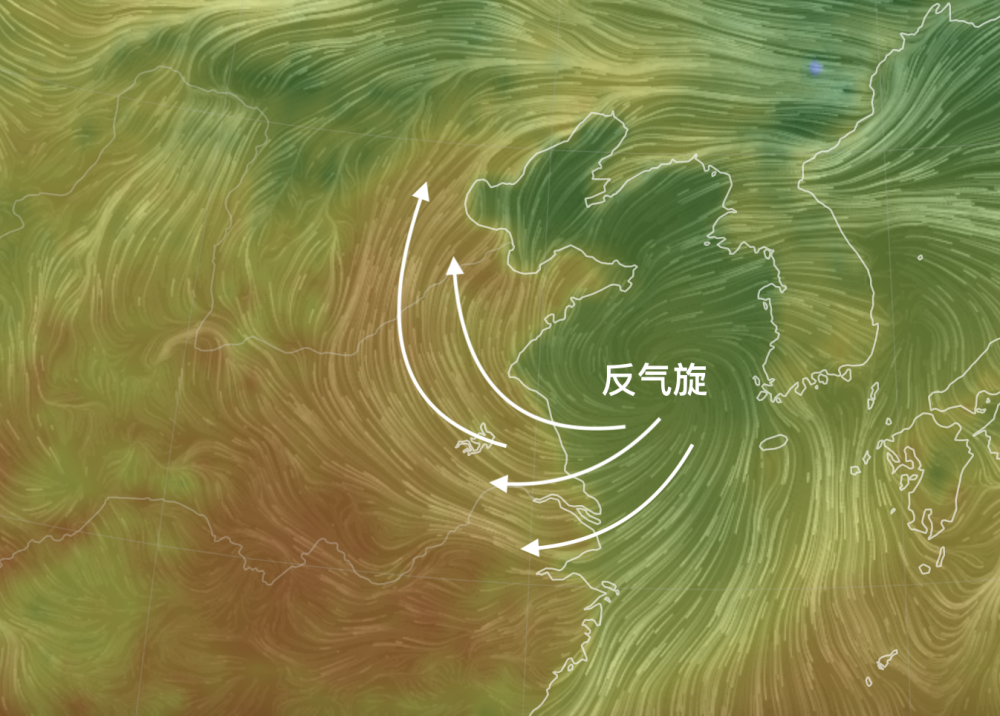 导致这种变化的主要原因,是有冷高压东移南下,今天在黄海上形成了一个反气旋系统。这样一来,江苏上海多地处在反气旋西南侧的东风控制下,吹来海上相对干净清澈的空气,使得空气质量有所改善。