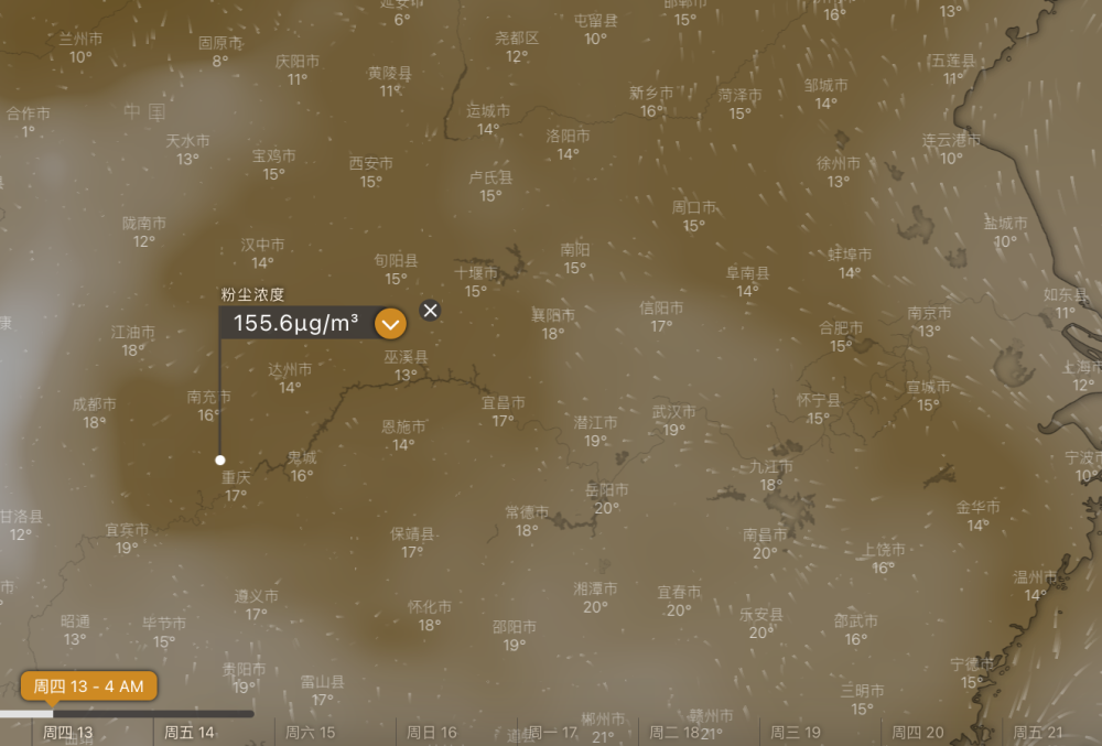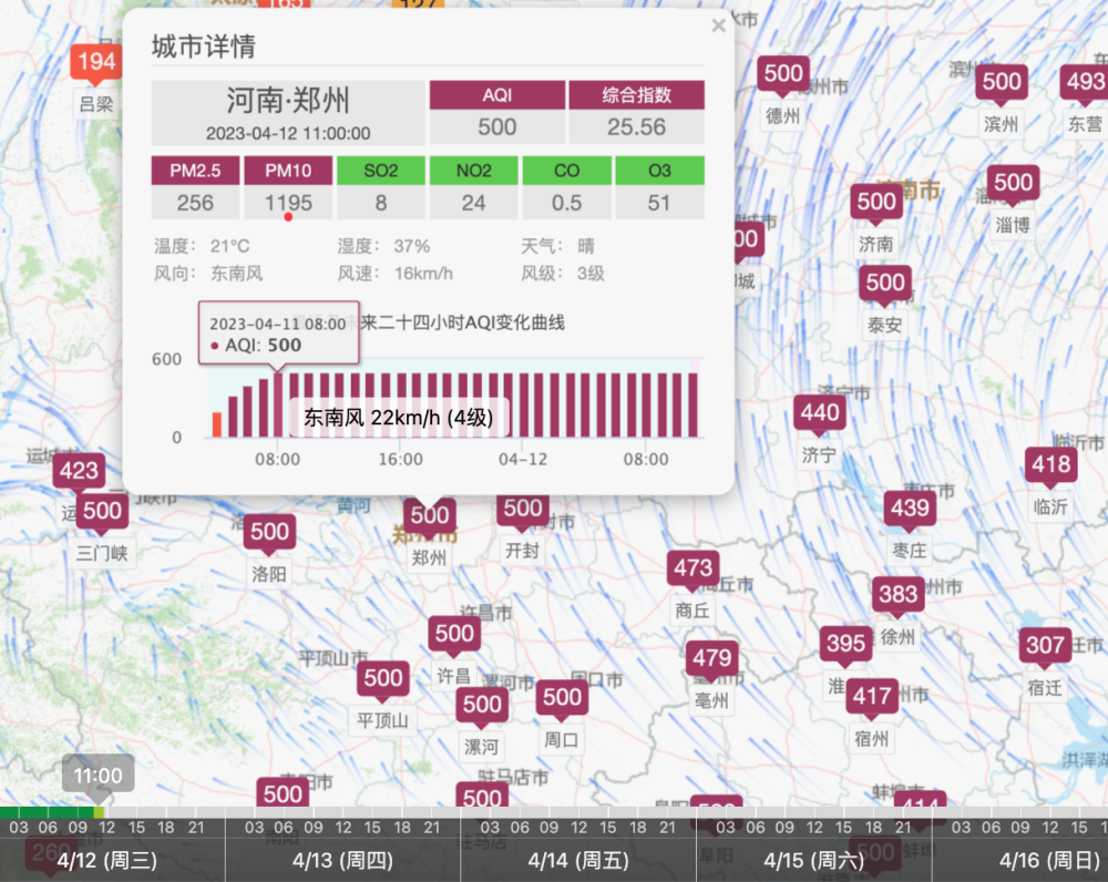 例如河南郑州,监测数据显示,在沙尘到来一天后,今天11点郑州PM10浓度仍高达1000单位以上。而空气质量指数AQI监测数据则显示,从4月11日上午8点出现500上限的爆表级别后,郑州已经连续超过24个小时出现爆表级别的严重污染,由于目前河南多地已经转为东南风,浓重沙尘还将持续笼罩。