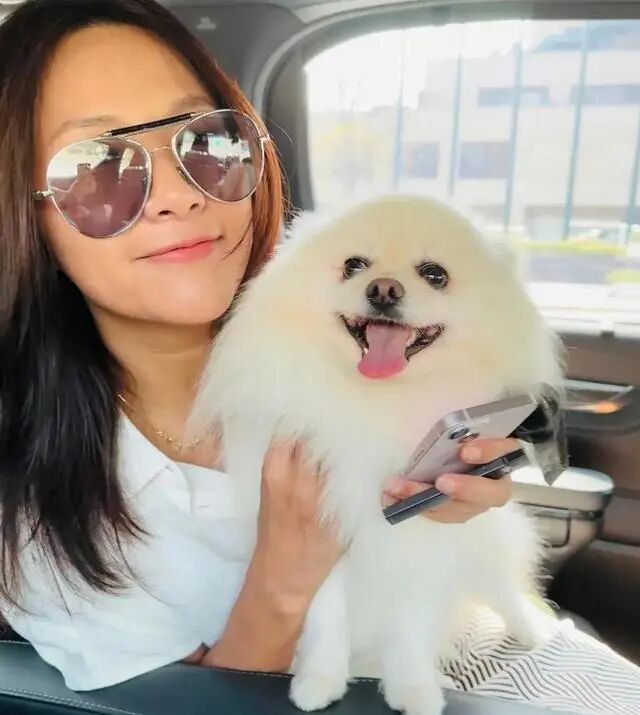 坐在豪车里,抱着一只可爱的小狗,露出灿烂的笑容。