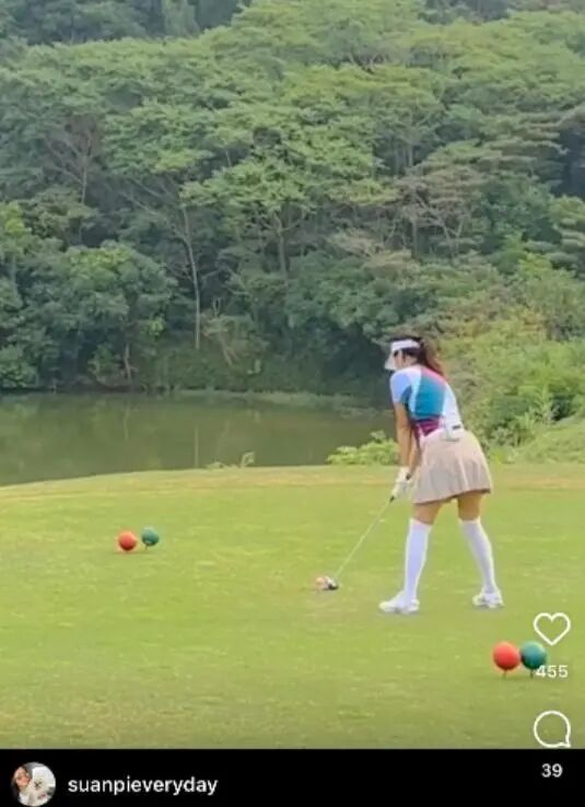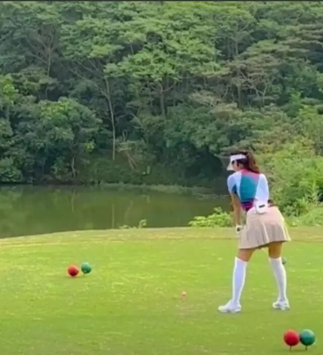 她穿着超短裙,头戴白色帽子,挥杆击球的样子非常潇洒,把依然苗条的身材显露出来。