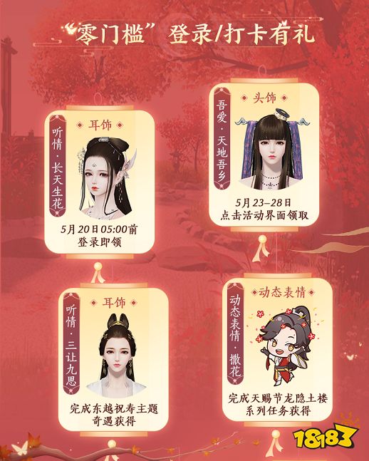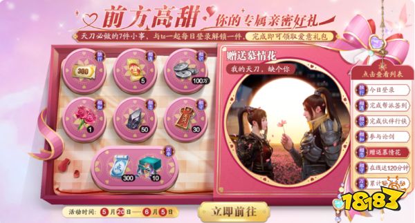 相伴江湖,刀刀必做的七件小事甜蜜献礼!即日起至6月5日活动期间,少侠每日登录游戏解锁一个专属亲密任务,在当日任务解锁后完成该任务即可点击左方获得对应礼包,礼包将直接发放至少侠邮箱,少侠们请注意查收~
