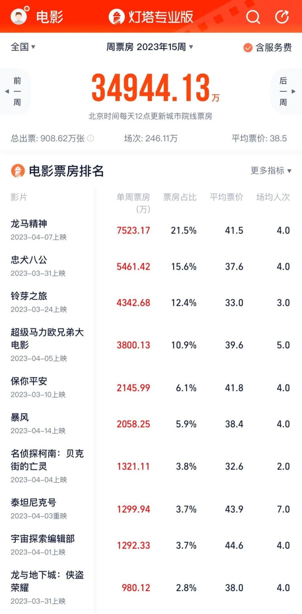 从4月10日至4月16日,2023年第十五周票房数据为3亿4944点13万,《龙马精神》成为单周票房冠军。