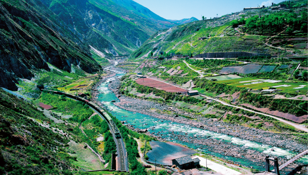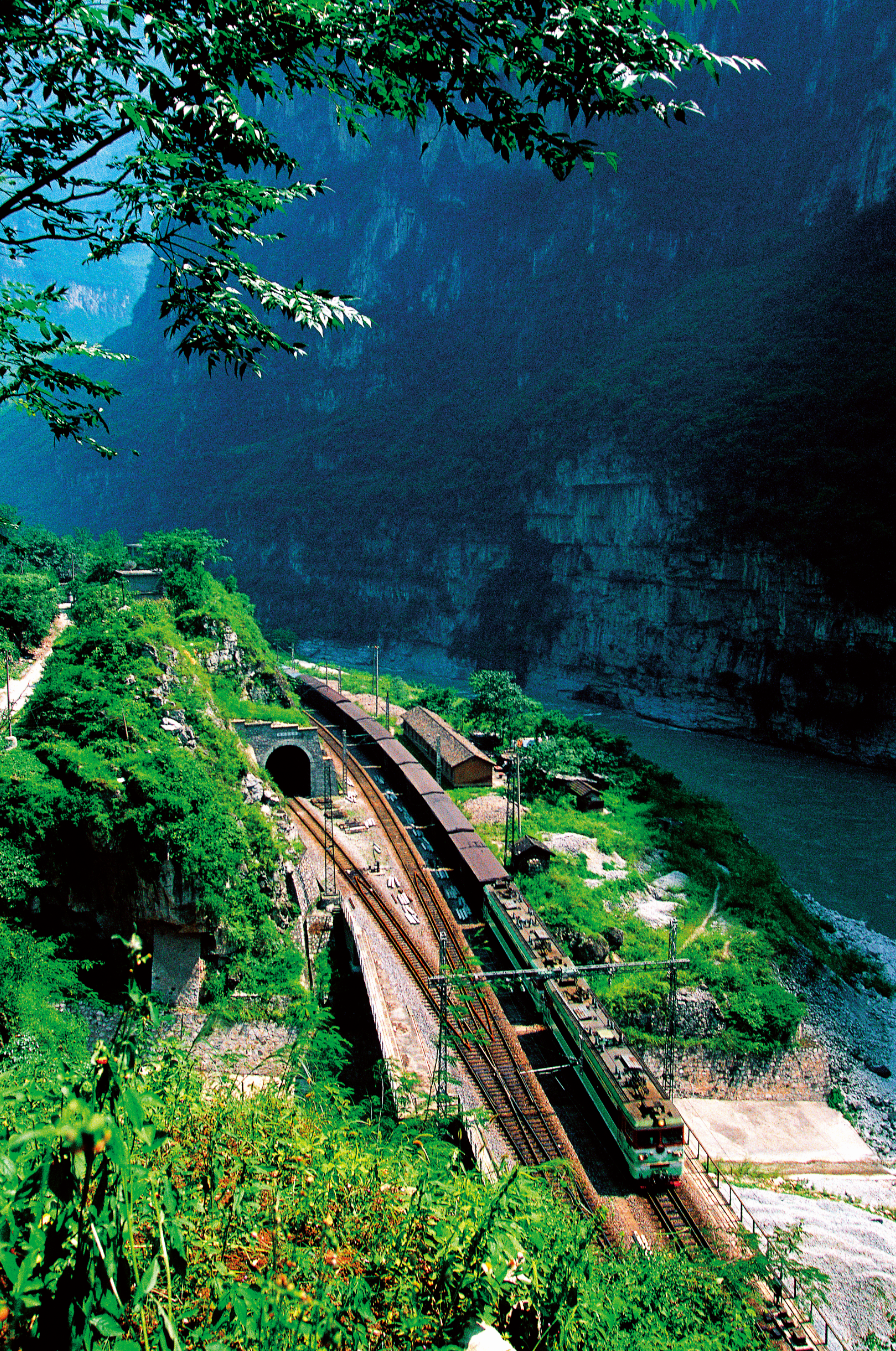 不仅如此。西线方案还需要穿越大、小相岭等多座山脉及多条地质断裂带。这些高山峡谷曾经让凉山地区几乎与世隔绝。为了跨越高山峡谷的阻隔,成昆铁路架设桥梁991座,开凿隧道427条,隧道总长度达到了340余公里,占线路总长度的31.5%。全线大小车站122座,有三分之一的车站找不到适宜建站的地方,只好建在桥梁上或者隧道中,关村坝车站就坐落于金口河大峡谷,三面环绕着高达400米的陡岩峭壁,波涛汹涌的大渡河昼夜奔腾不息。
