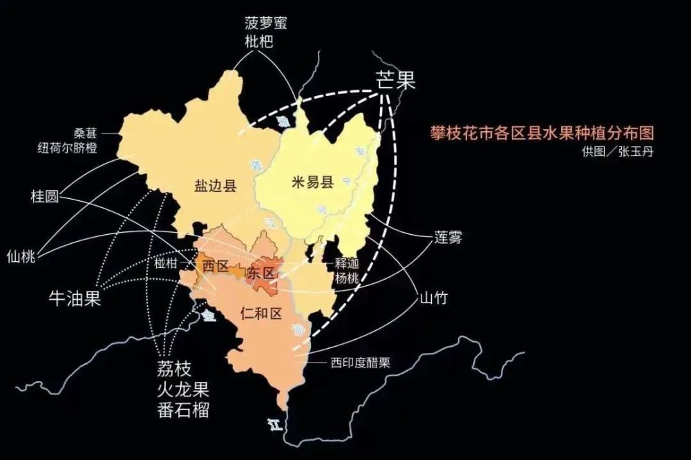翻越大凉山之后,便会到达以安宁河谷、金沙江河谷为代表的川西南地区,这一地区是亚热带干热河谷地带。不同的气候类型使得成昆铁路沿途的物产也各不相同,汉源特产花椒——汉源贡椒,甘洛县平均海拔较高,多种植梨树等温带作物,在上世纪盛产“罐罐梨”,攀枝花、西昌则是四川重要的亚热带水果生产基地,盛产芒果、枇杷、莲雾、石榴、草莓、樱桃等特色水果,一年四季鲜果不断。从成都至攀枝花,我们将在行进间感受气候的神奇变化,从气候到物产,我们认识一个不一样的风物四川。