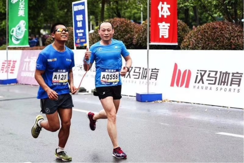 公云峰在汉马上为视障跑者陪跑