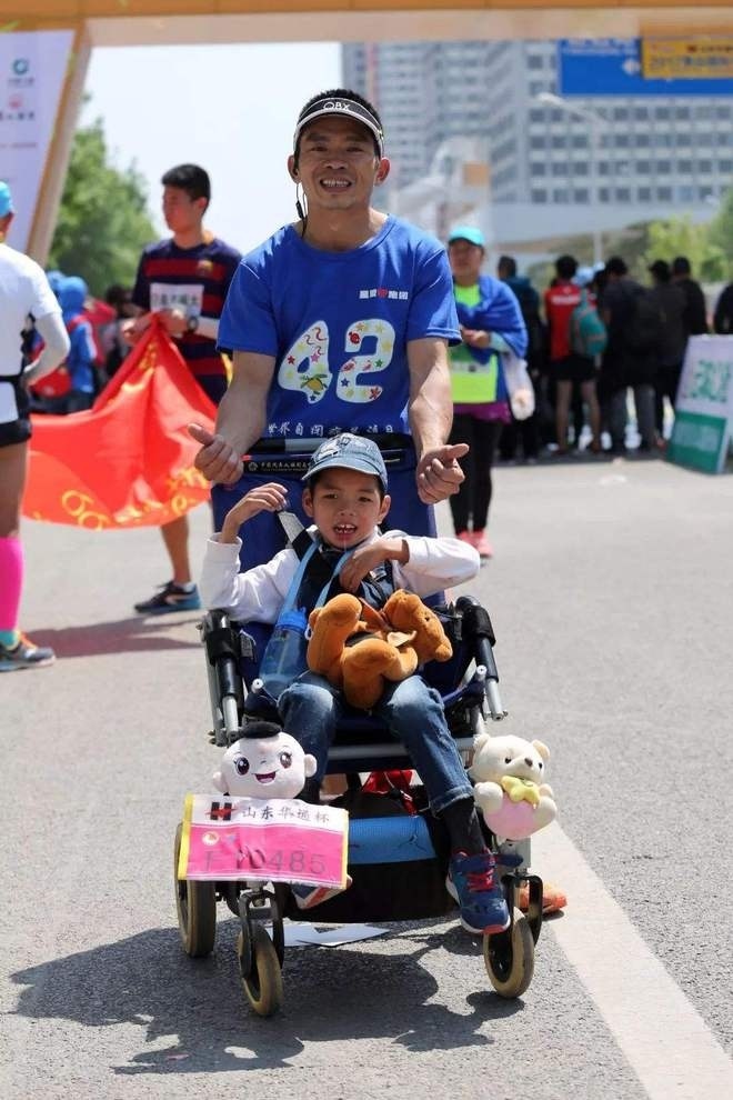 罗书坚推着患病的儿子跑完汉马全马