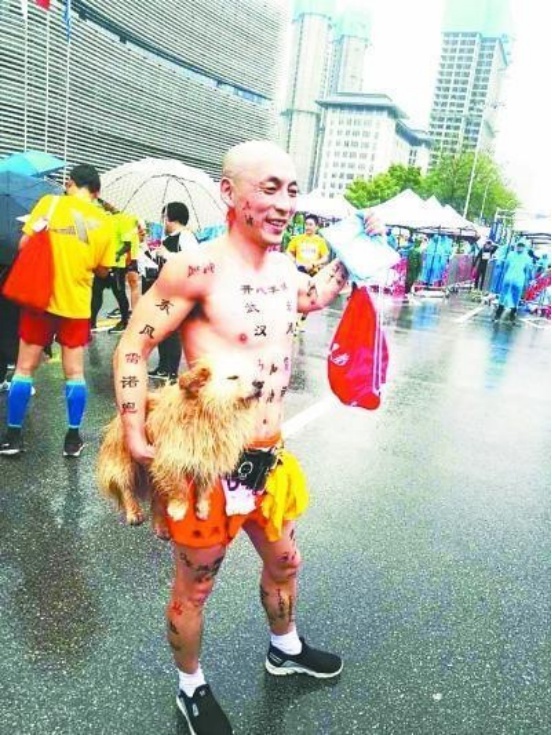 2017年第二届“汉马”,光头,光膀子,脸上、脚上、前胸后背都涂满了彩绘,只穿着一条运动短裤的周汉华和他的宠物“马拉多”,成为最受欢迎的半马明星选手。