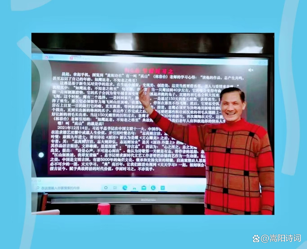 21年,市老年大学扩招,入诗词班、写作班。6月22日,入西乡诗社。写两组顺口溜为折枝,林社长提携代作,名上美篇。同年11月4日,入嵩阳诗社。今年3月18日入阳光诗社。从此,谈吐有鸿儒,往来无白丁。