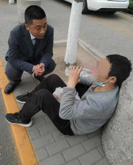 在离店门口不远的地方,一名男子躺在地上,双眼紧闭,意识已经有些不太清楚,无法正常交流。王会彬和同事赶紧把男子扶起来,让他靠坐在路边的一个石墩旁,又跑到便利店给他买了食物和水。吃完东西后,男子才慢慢恢复了一点体力和意识。