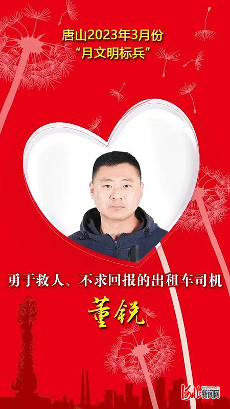 董锐,丰南区出租汽车服务处司机。2月20日14时左右,一位女士在某小区南门附近的公交车站下车时突发心脏病,她拦住了董锐的出租车,对他说明了情况。董锐看到这名乘客的状态很不稳定,便努力稳住对方情绪,同时极速驾驶车辆前往医院。由于路上比较堵,看到在路口执勤的交警,董锐很快向其说明了情况,由交警带路后顺利抵达了医院。到医院后,董锐把乘客送到急诊室,并一路陪着做检查,直到乘客家属赶到医院后董锐才离开,也没有收取乘车费用。事后这位乘客一直在寻找董锐,她说:“这位师傅特别有爱心,真的特别感谢他!”面对乘客,董锐却说:“这是我应该做的,在当时的情况下,我们出租车司机都会这样做的。”