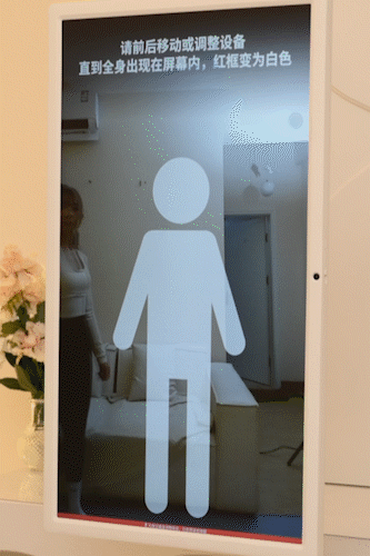 在运动开始前,它会先进行人体识别,会有提示站到屏幕上指定的框里,位置不合适的话,框就会变成红色,站位合适后,你会发现自己变成了右上角的一个小人。▼