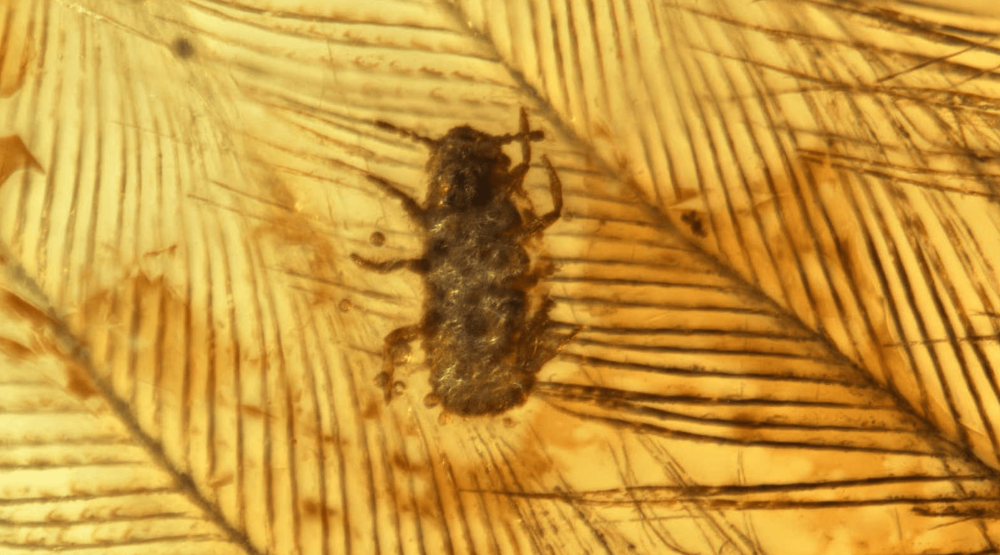2019年的研究详细描述了一块含有恐龙羽毛的琥珀,其中还包含了一种名为“Mesophthirus engeli”的虱子状昆虫。羽毛受损的迹象表明,这些虫子实际上是寄生在它们的宿主身上,而不仅仅是挂在同一块树脂中被丢弃的羽毛中。这块琥珀是在缅甸发现的,可以追溯到大约1亿年前。