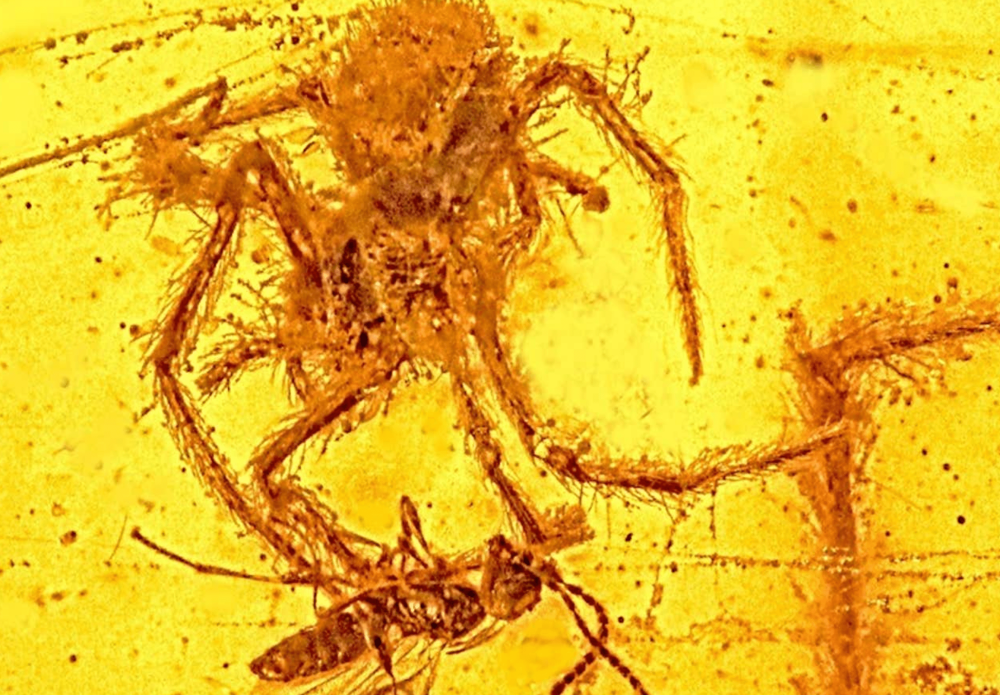 这是我最喜欢的琥珀化石之一,因为它戏剧性的场景和精致的保存水平。当蜘蛛正要咬下寄生蜂时,树脂突然倾泻在这对冤家身上,当时寄生蜂可能正在偷吃蜘蛛卵。这块琥珀是第一块记录蜘蛛攻击行为的琥珀,它在缅甸被发现,可以追溯到白垩纪晚期,在9700万到1.1亿年前。