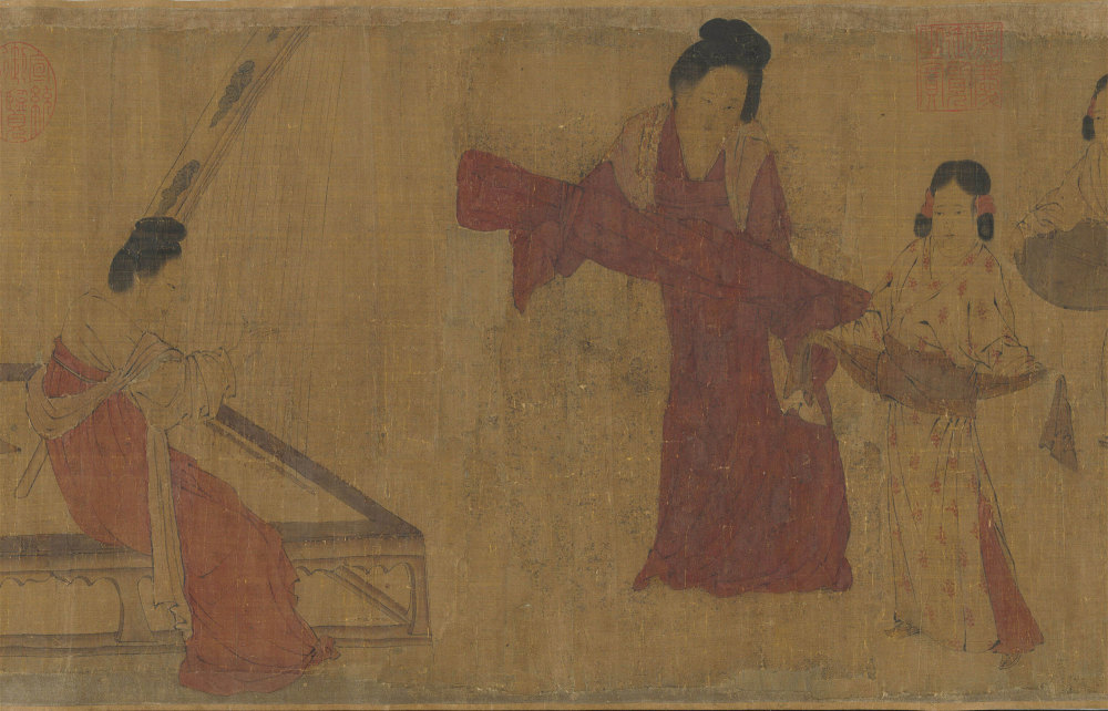 特展按照主题及年代,选展七十一组(件)院藏精品,内容分成“群芳竞秀”与“女史流芳”两大单元。前者是以宏观的角度,依序展陈自五代迄于近现代的绘画,包括传唐周昉《调婴图》《内人双陆图》、宋代李公麟《画丽人行》以及宋元时期的宫廷后妃画像、明清时期名家笔下的仕女图等。