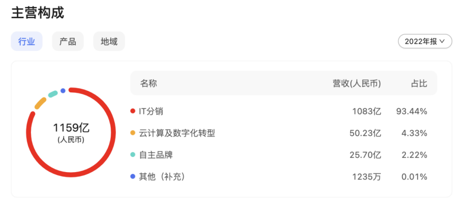 以2022年报为例,IT分销业务营收1083亿元,占比93.44%;云计算及数字化转型业务营收占比仅4.33%。