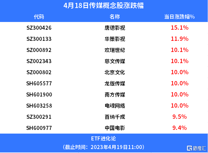ETF方面,银华影视ETF大涨4%,国泰影视ETF涨超3%,广发传媒ETF、鹏华传媒ETF涨超1%。