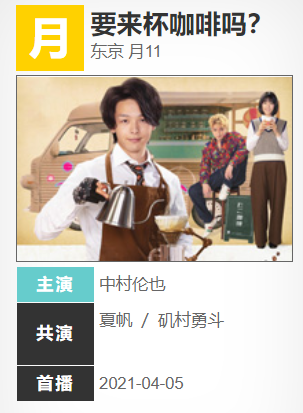在这部剧中,中村伦也将要饰演一名咖啡店老板,对每天生活辛苦想要被治愈的人、重新审视人际关系的人、喜欢咖啡的人,带来治愈的故事。