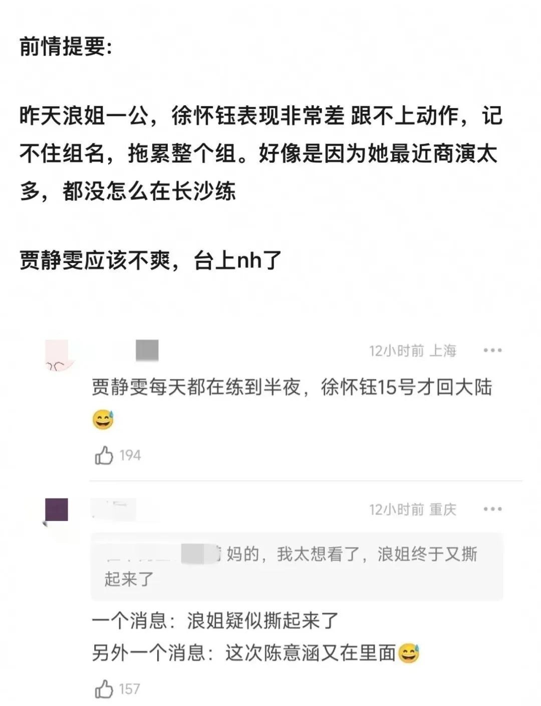 说被她同组的贾静雯站出来当场内涵了,因为贾静雯为了小组胜出天天努力练习,但最后徐怀钰却没打好配合,拖了后腿。