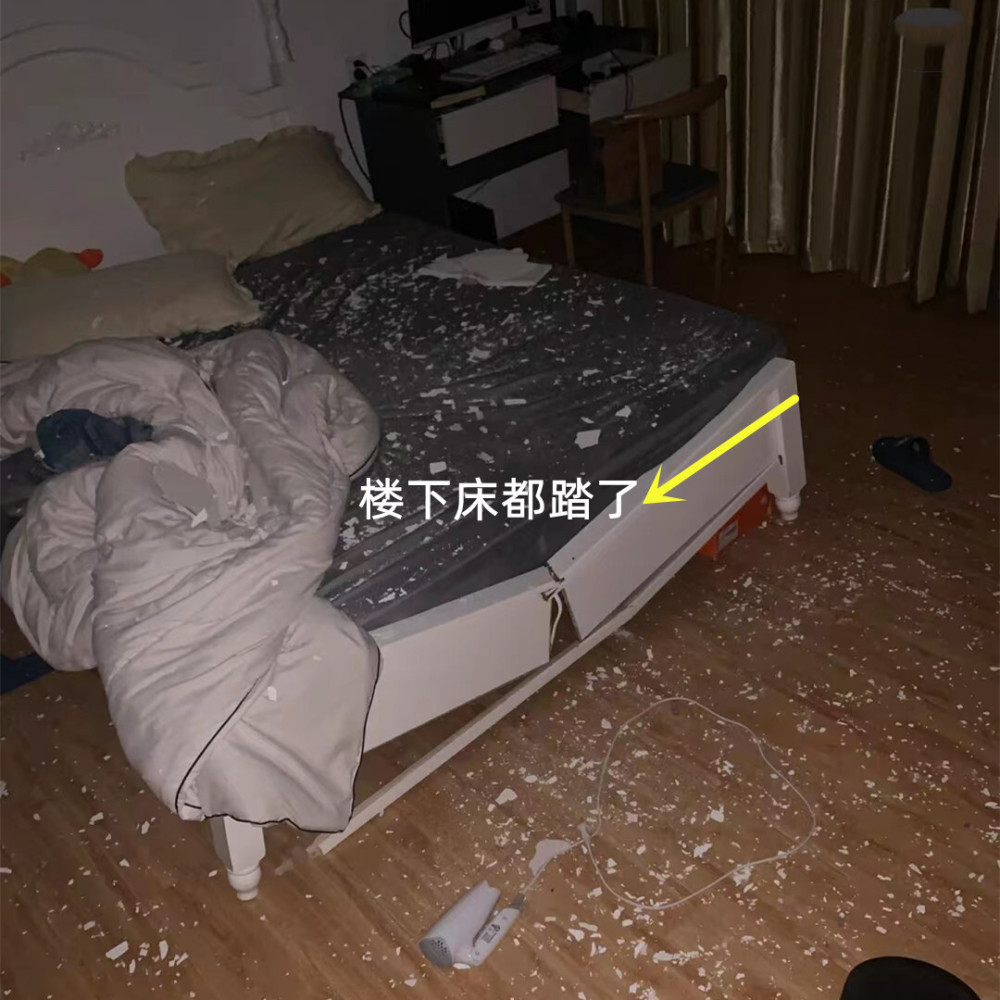 “有个男人从楼上掉下来了,然后我睡的床就变成这样了”