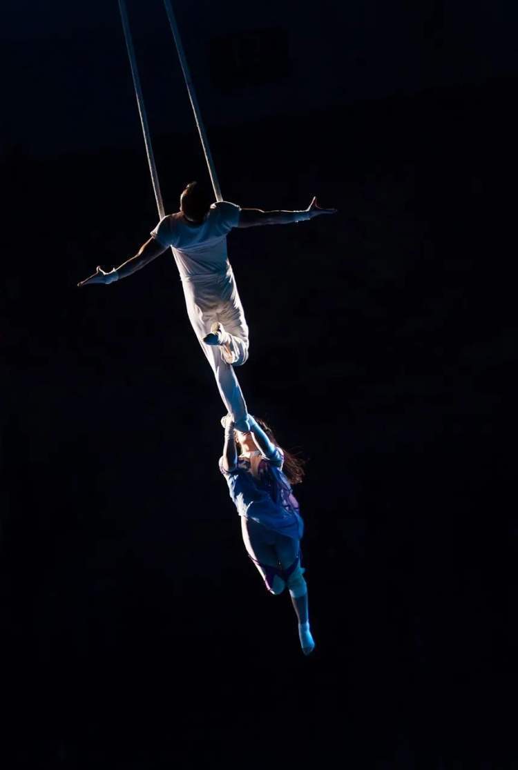 从观众席仰头看,穿着蓝色服装的女演员被绸带倒挂舞台上空。另一个同样被绸带牵引带升的男演员,上前拉住她倒悬的手。随着吊机的运作,两个人转眼间已经升至十几米的高空。