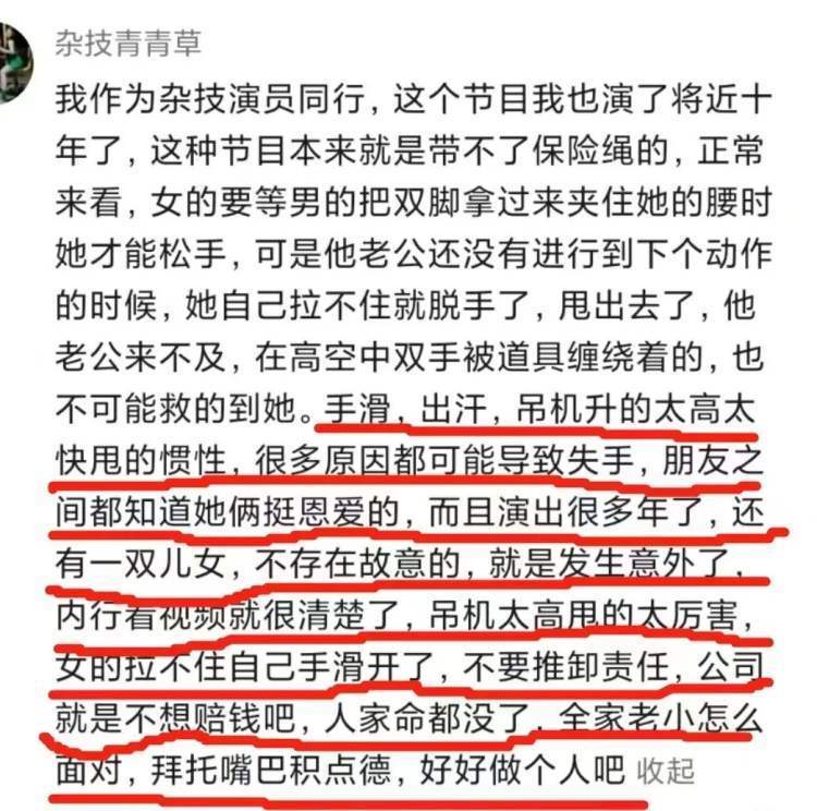 事发之后,根据该表演公司负责人的讲述,现场表演的演员既是多年搭档,也是夫妻。演出公司负责人对媒体表示,出意外是因为这对夫妻在演出前吵架了,因此没有扣好安全扣。事后,其搭档,也就是杂技演员的丈夫张某,否认了这一说法。安全扣一说,也在随后被证实是谎言。