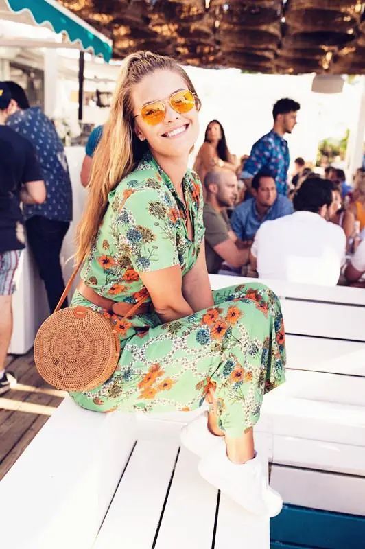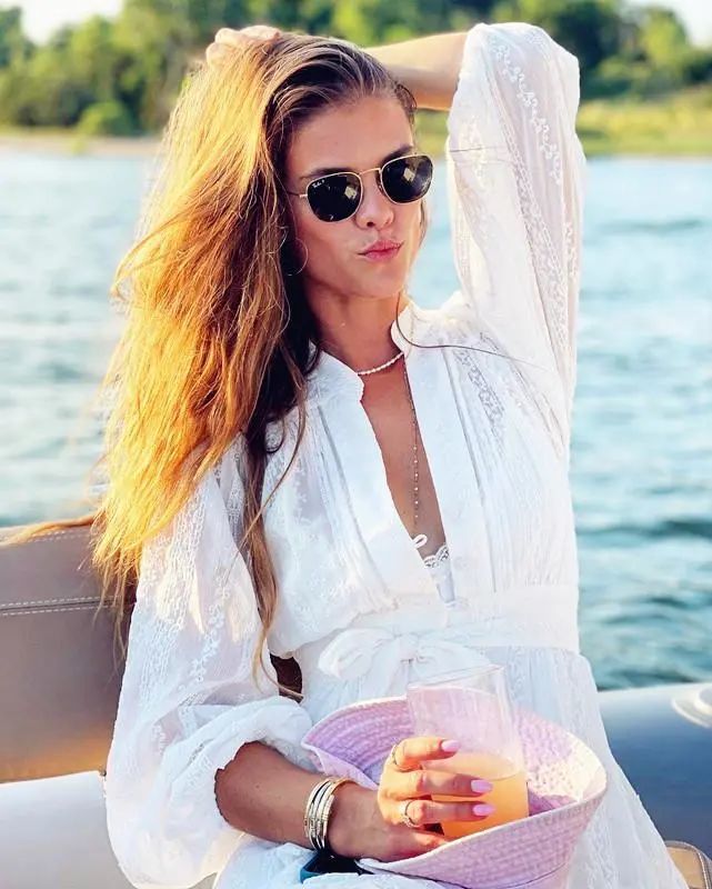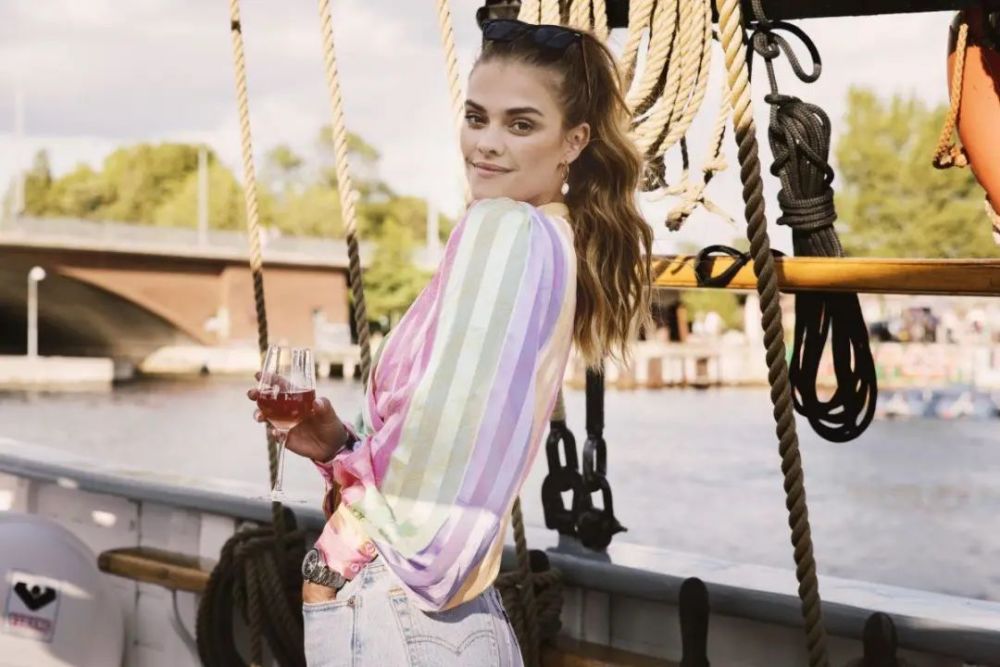 Nina穿着条纹的彩虹衬衫,白色的牛仔裤勾勒出大长腿,喝着香槟,赏着河水清趟,也是一种人生幸事。