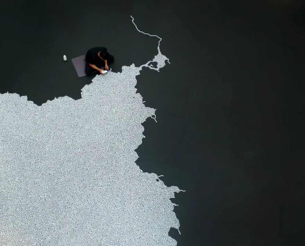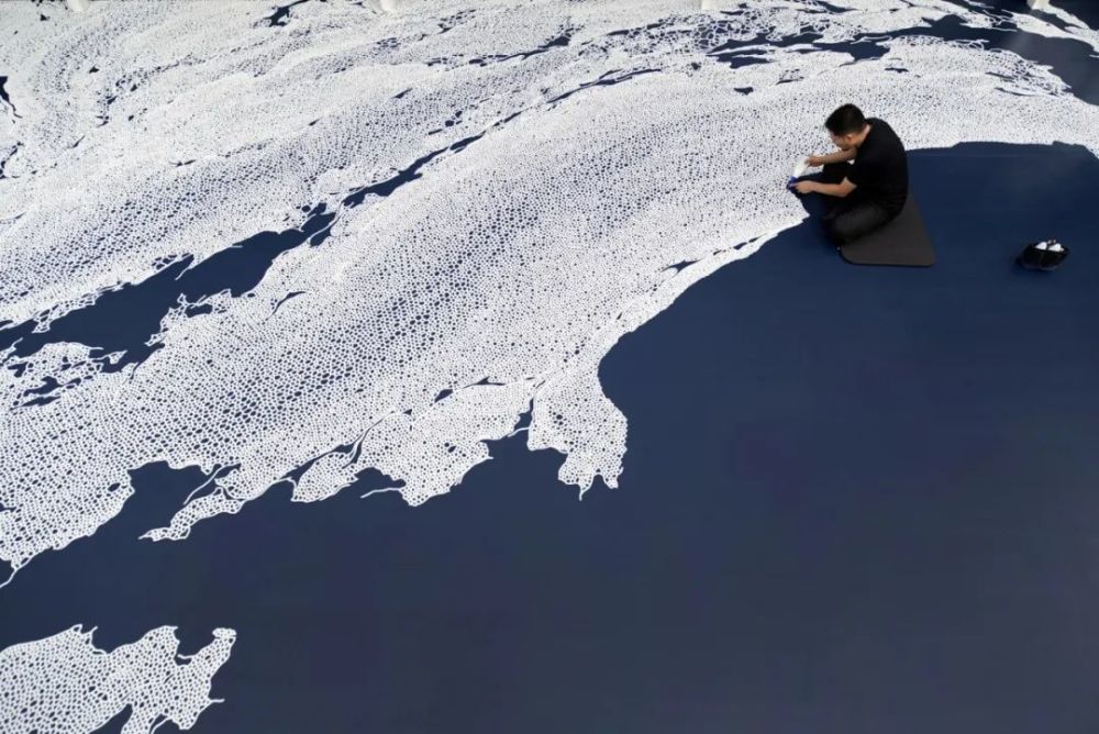 山本基的许多作品都是用盐绘制的巨大图案,艺术家通过长时间坐在地板上绘画,试图保留那些随着时间推移逐渐消失的记忆,“我一直在努力,我想这样就不会忘记与家人的回忆”,山本基说。