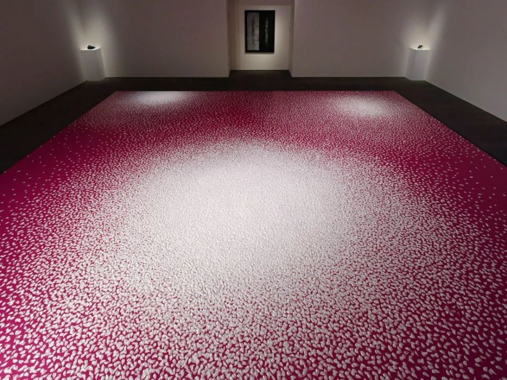 今年春天,山本基在濑户内市立美术馆举办了个展,展出的作品《Sakura Shibefuru》,就是用盐制作的樱花花瓣。它的灵感来自著名的樱花季:当樱花的花蕾落下,正是花季结束的时候,所以在日本俳句里,“Sakura budfall”也是晚春的“季语”(一种描述特定季节和时令的词汇)。想到花朵消散的未来,艺术家便创作了这件作品,将10万多片“盐瓣”散落到绯红的地板上。