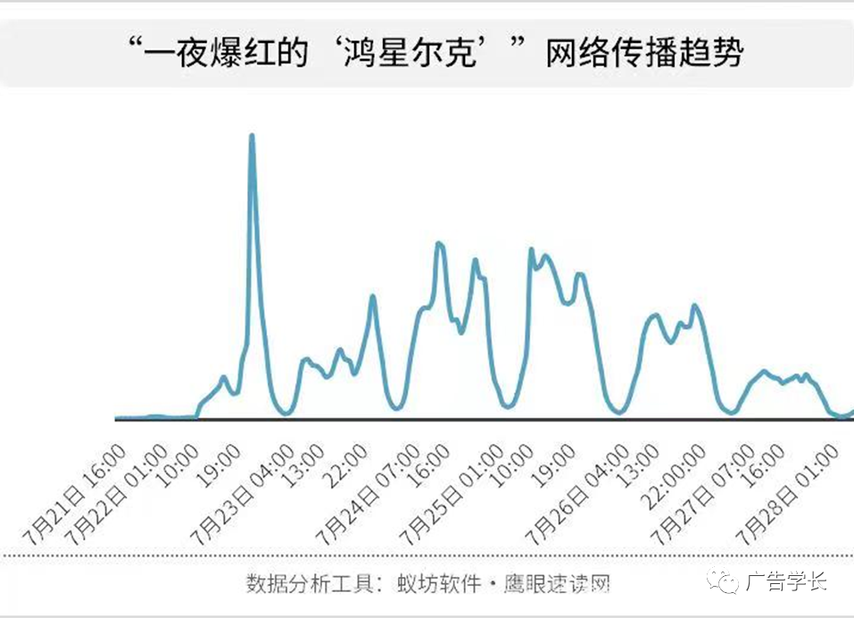 7月23日罗永浩直播间,一位叫“鸿星尔克总裁”的用户占据榜一的位置,引发讨论;自媒体以“鸿星尔克”为创作题材的各种文章、短视频,传播超10万+的不胜枚举;人民日报等顶流,点名表扬,各路媒介纷纷正面报道;抖音UGC传播,用户自发创造短视频;线下门店爆满,引发消费者跟风;江苏南京,有人买了500块钱的东西扫了1000块就跑了,引发各种新闻媒体的后续报道。