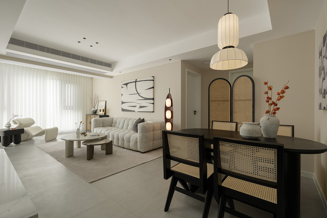如果觉得棕色过于深沉,也可以选择更为温润轻快的裸色,裸色的藤编餐椅与黑色的椭圆餐桌的结合,让原本厚重的空间得到了释放和平衡,点缀精致的米色吊灯,时尚又不单调,高雅却又内敛,使整个空间都洋溢着满满雅致的小温暖。