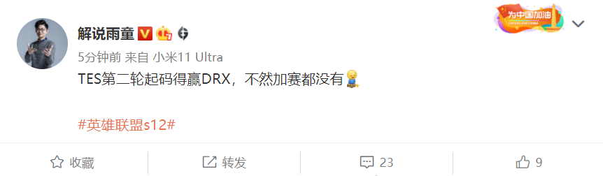 而在TES输给RGE,同时DRX赢下GAM后,TES想要从小组赛出线的难度就更大了。直接晋级8强必须TES在小组第二轮3战全胜,并且RGE还要赢下GAM和DRX,只有这种情况下,TES是小组第二出线。但是如果小组第二轮中,RGE输给DRX了,那么TES还需要打加赛来确定晋级名额。而TES如果在小组赛第二轮中,输给DRX,那么基本上没有8强的可能性了,所以最差TES也要在第二轮中击败DRX,确保自己还有加赛的机会。这一点解说雨童也在赛后做出了类似的分析。