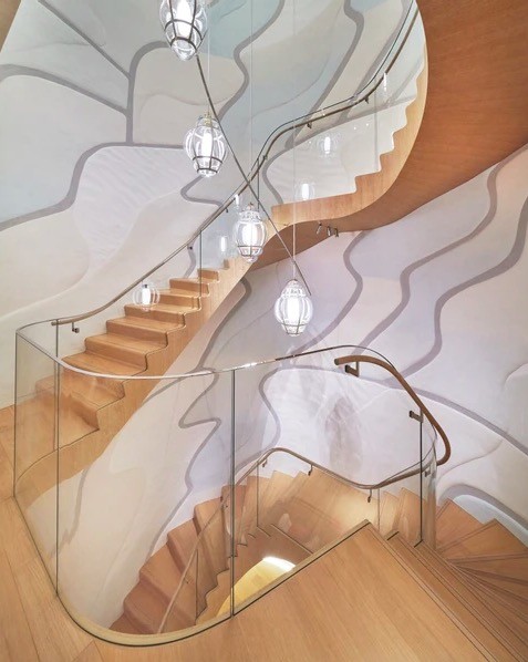 在彼得·马里诺(Peter Marino)的设计下,蜿蜒的中央楼梯上,玻璃连同橡木地板,强调着建筑物的有机美学,墙面上同样曲曲折折的线条,恍若水波一般流动。