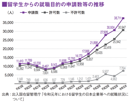 据JASSO统计,截至2020年5月1日,日本留学生数量为279,597人。2019年以在日就职等为目的进行在留资格变更的留学生数量为38,711人,其中30,947人获得许可。