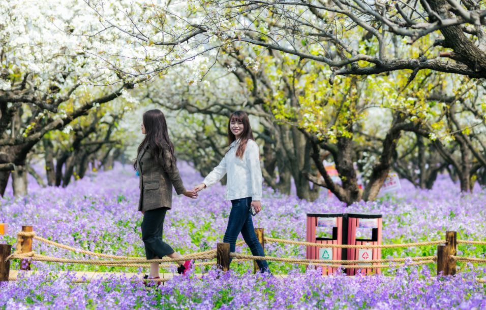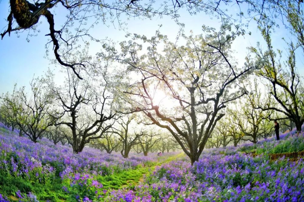 星斗昭回自一天,今朝有花今朝醉。白天,当梨花与二月兰相遇,抬头白、低头紫,风景如画,宛若仙境!这样的画面随手一拍,都是大片!