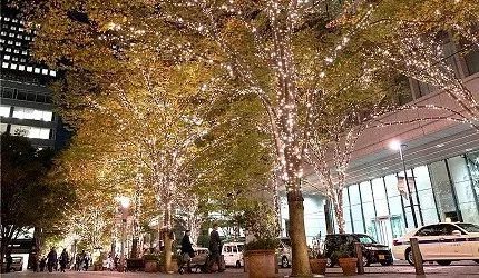 东京车站附近、连接有乐町、大手町等区域,长达1.2km的「丸の内仲通り」上,两排约200多棵路树挂满了超过一百万颗香槟金色的LED灯饰,且所有灯泡的电力来源皆来自于天然的太阳能、风力发电等。为城市营造出浪漫圣诞气氛的同时,也不忘环保与爱护地球的思维,非常有日本人的风格。