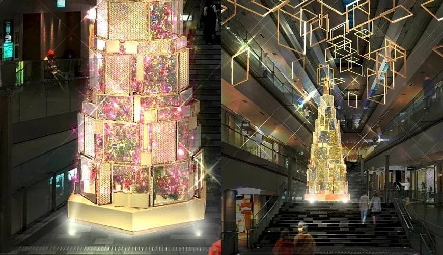 时尚街区表参道的代表性商场「表参道Hills」,今年的圣诞灯饰由前卫设计工作室「we+」所规划设计,以「水之魔法的诱惑」为主题,将40个特殊构造水箱组成巨型圣诞树,巧妙利用吸水性材质以及水位的变化,让圣诞树外观呈现如梦似幻的形色变换,搭配音乐与灯光的共演,气氛既前卫又浪漫!
