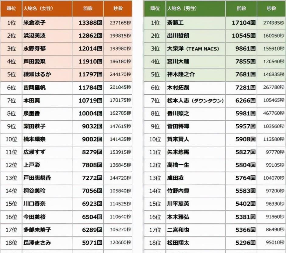 此外,第5名是绫濑遥【1万1797次/24万4170秒】,第6名是吉冈里帆【1万1784次/20万1045秒】,第7名是本田翼【1万719次/17万175秒】,第8名是泉里香【1万4次/16万2705秒】,从去年的榜外急速上升。
